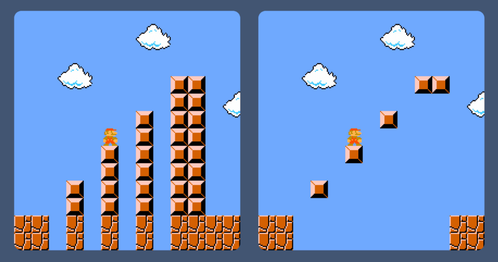 That’s where UX comes into play. UX influences the perception the user has of any AI application. An API endpoint does not look intelligent to most people, but a chatbot interface might, even though both are essentially the same thing. As brilliantly illustrated with these 2 Mario Bros screenshots, UX is precisely about leveraging the difference of perception between things that are essentially the same: